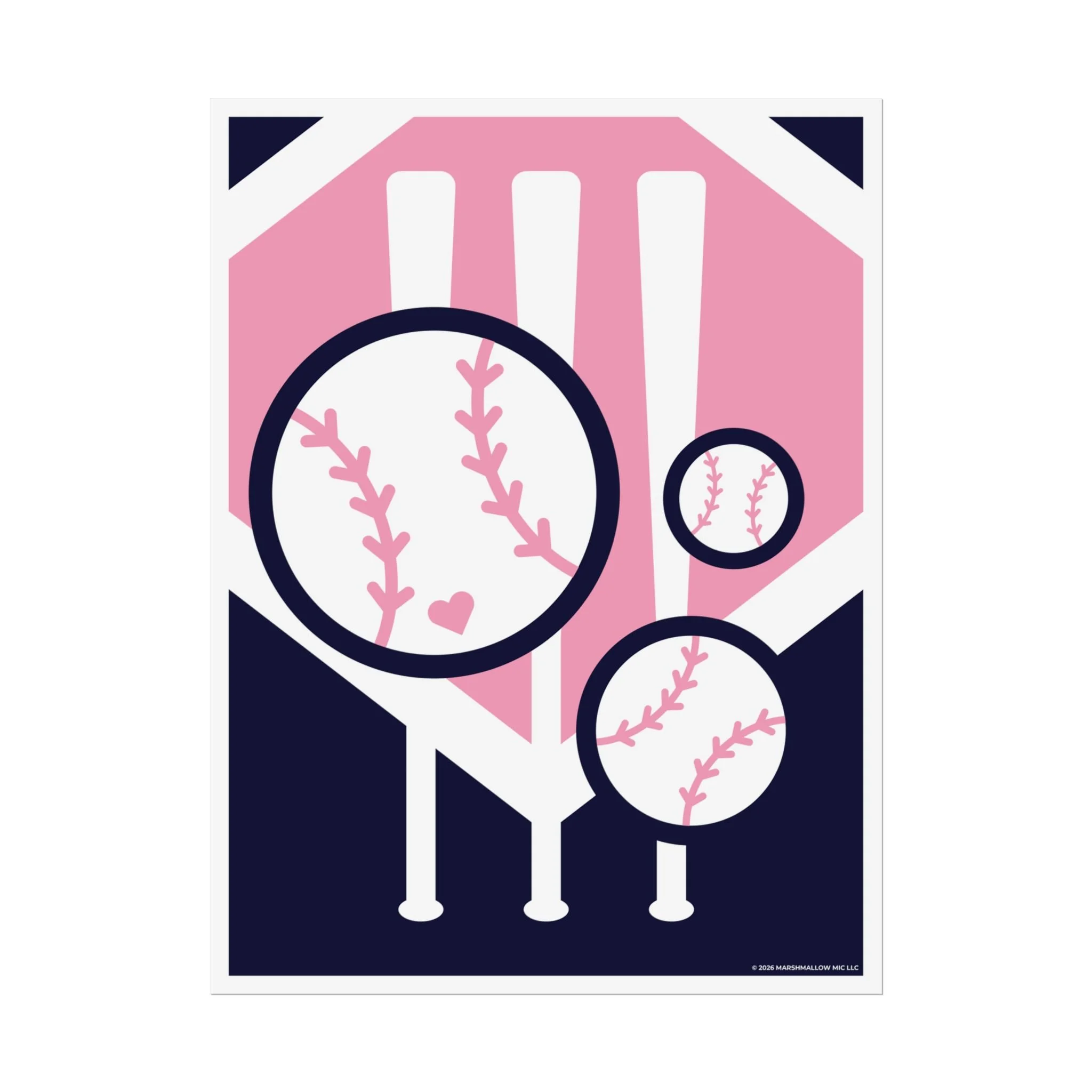 A vibrant rolled poster that brings a playful, modern take on baseball into any room. Bold navy silhouettes of bats and tees sit against soft pink octagonal shapes, while oversized baseballs—with sweet heart-shaped stitching—float in the composition. The clean, graphic layout reads like a contemporary sports print, balancing energy with a whimsical touch.