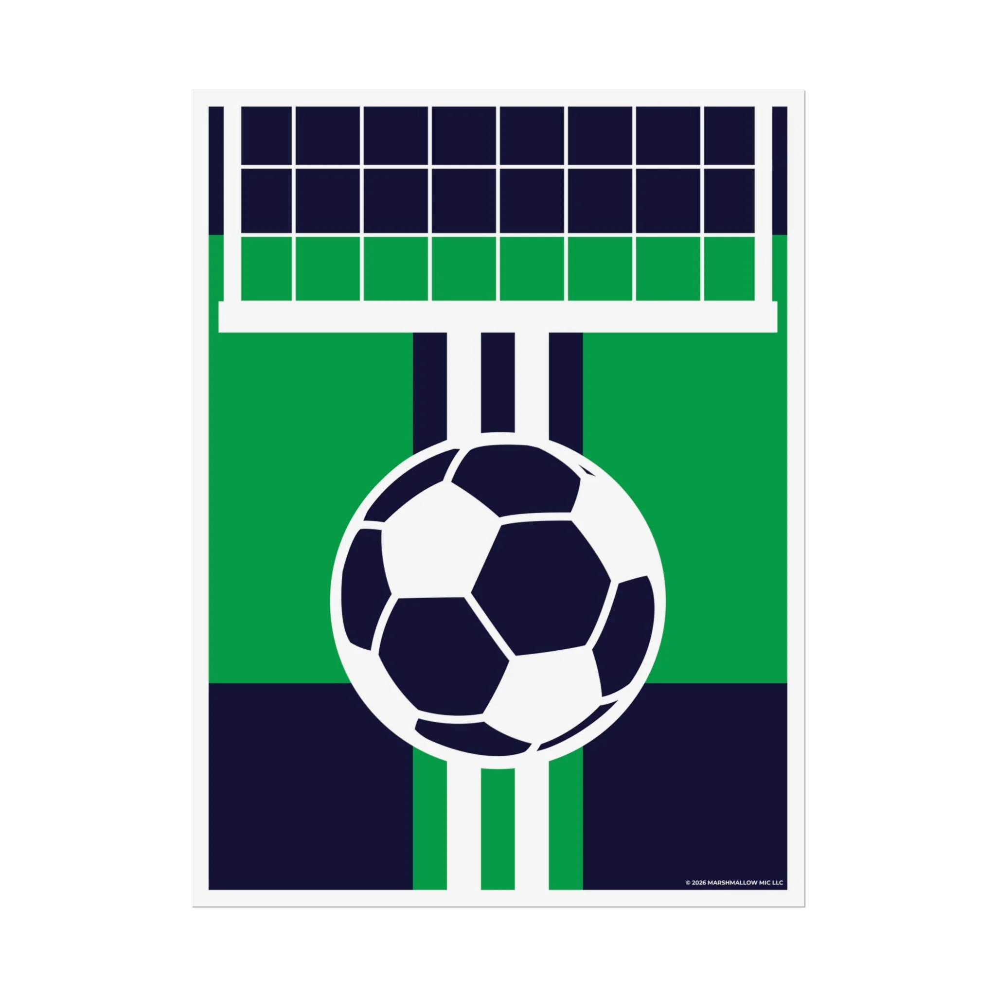 A rolled poster that brings stadium energy into any room. Bold blocks of green and deep navy frame a graphic soccer ball beneath a stylized goal—clean, modern, and charged with motion. Hang it in a dorm, rec room, or training space to add a sporty focal point that feels like kickoff every time you glance at it.