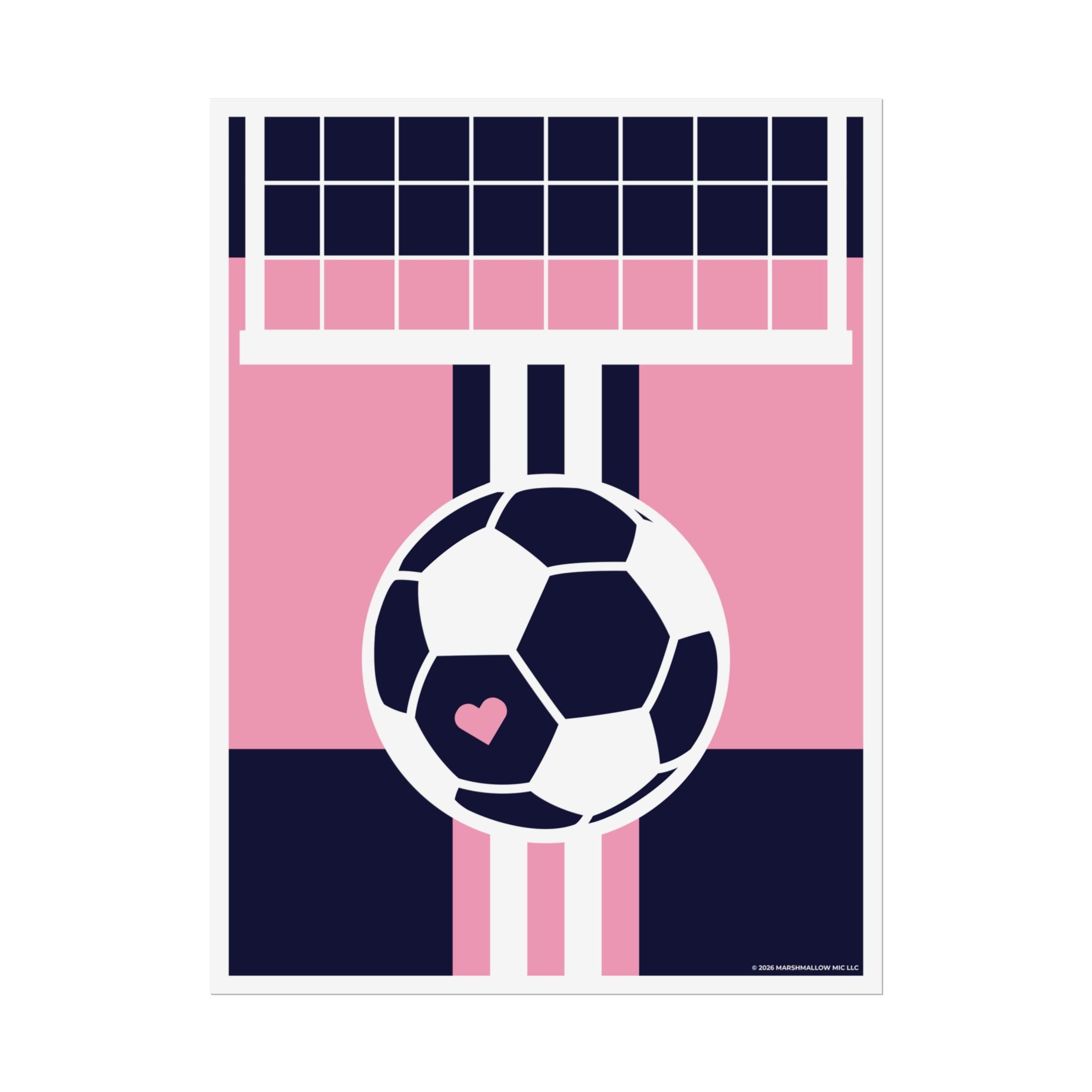 This rolled poster brings a playful, graphic energy to any wall. Bold blocks of navy and blush pink frame a central soccer ball motif, complete with a tiny heart that brings a whimsical touch to the sporty vibe. Clean lines and a modern, almost retro-sports layout make it feel both energetic and warm—great for a bedroom, locker room, or studio wall where personality matters.